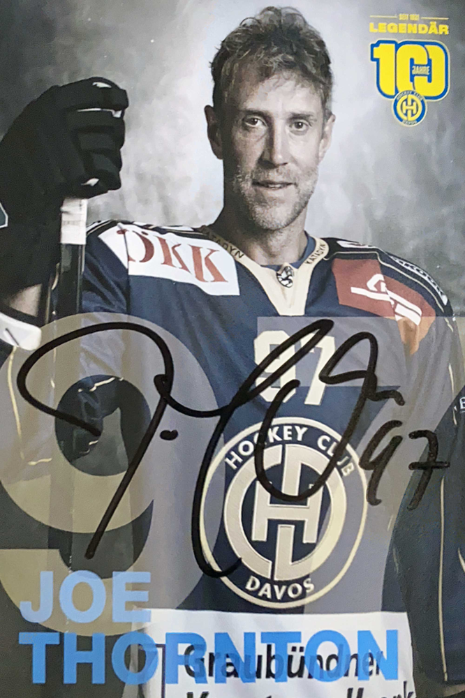 Joe Thornton, HOF 2025, 25 NHL Seasons, 1901 NHL Games, played during last 2 lockouts + beginning of 20/21 Season for HC Davos 85 Matches, 5 x NHL Allstar, World Champion Silver Medal, Olympia Winner, Spengler Cup Winner, Swiss Champion, Cap signed at Spengler Cup 2022 in Person, Card bought at HC Davos Shop
